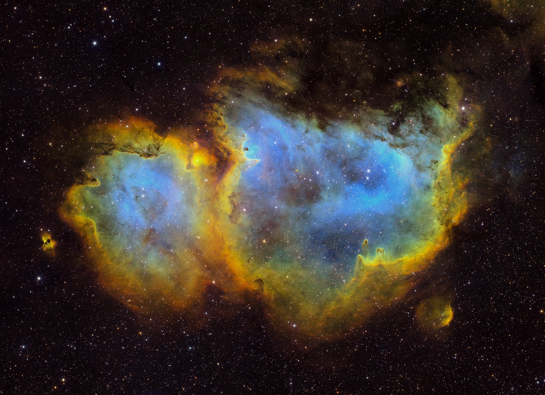 | Exp. idő: | 39,5 óra SHO, 40x900 Ha, 59x900 SII, 60x900 OII |
